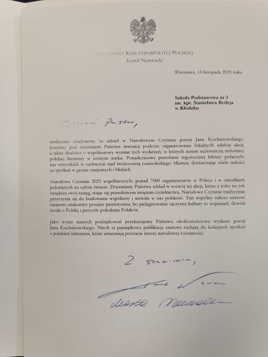 Jest nam niezmiernie miło poinformować, że Prezydent Rzeczypospolitej Polskiej Pan Karol Nawrocki wraz z Pierwszą Damą wystosowali do naszej szkoły List z podziękowaniem za udział w tegorocznej edycji Narodowego Czytania