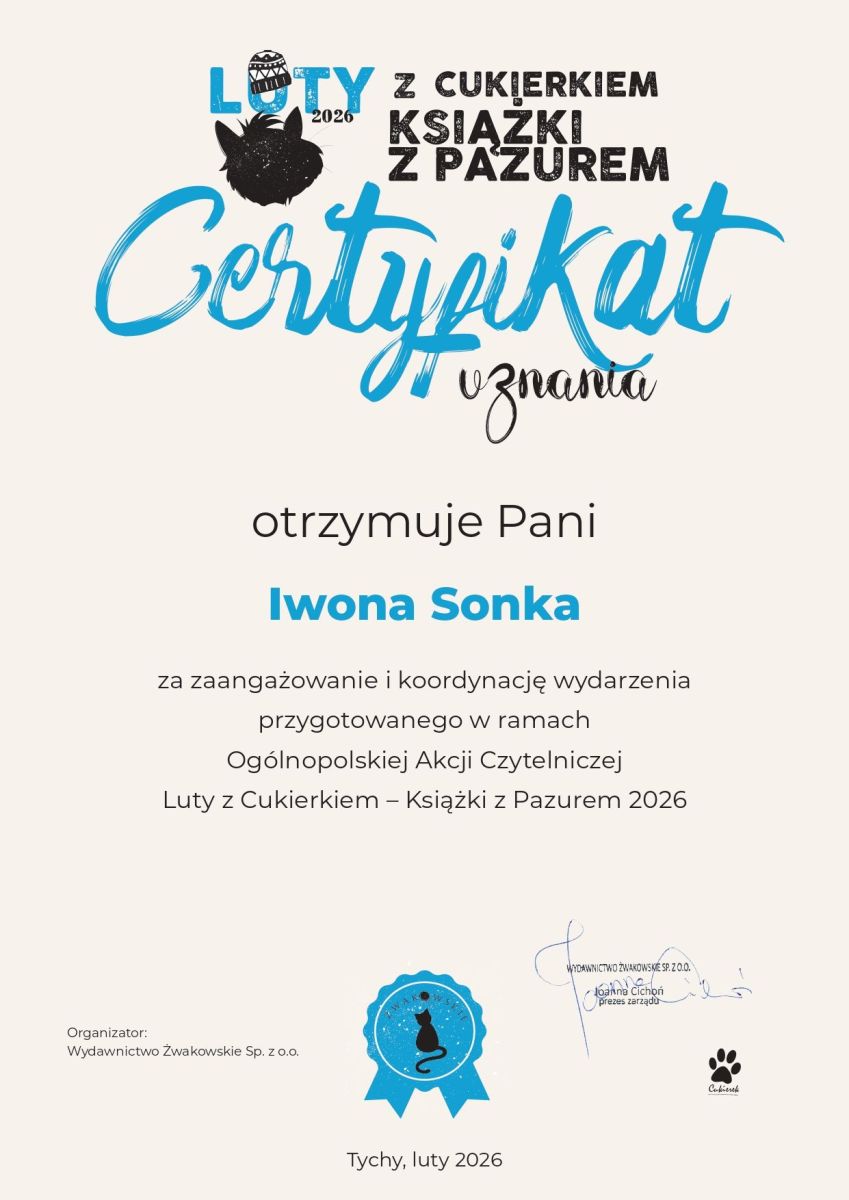 Informujemy, że nasza szkoła otrzymała Certyfikat potwierdzający udział w Ogólnopolskiej Akcji Czytelniczej: Luty z Cukierkiem - Książki z Pazurem. Zachęcamy również uczniów z klas: I - III do udziału w Ogólnopolskim Konkursie Plastycznym: Cukierek