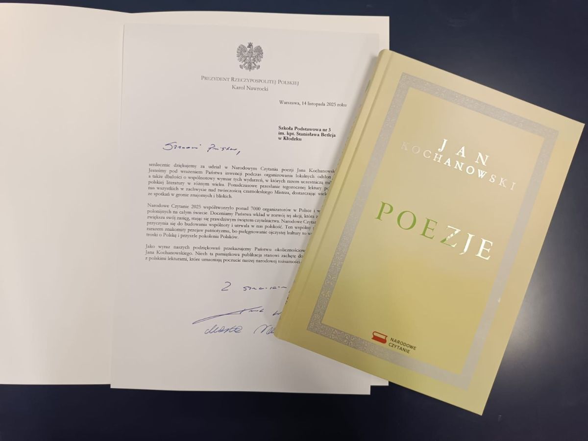 Jest nam niezmiernie miło poinformować, że Prezydent Rzeczypospolitej Polskiej Pan Karol Nawrocki wraz z Pierwszą Damą wystosowali do naszej szkoły List z podziękowaniem za udział w tegorocznej edycji Narodowego Czytania