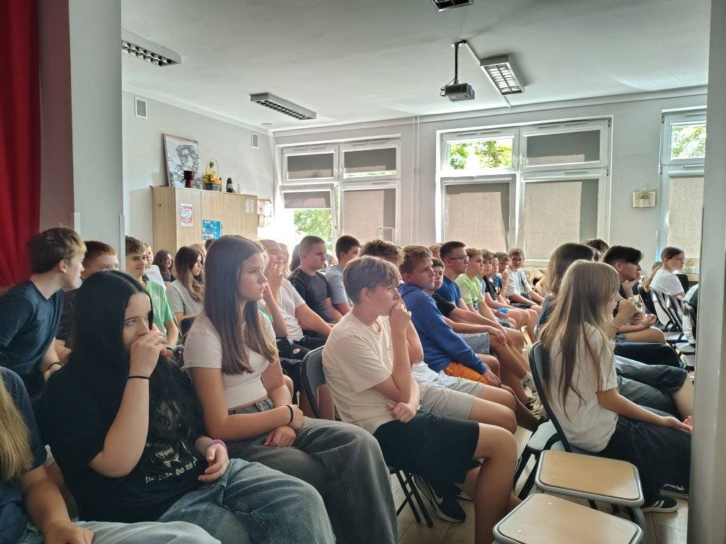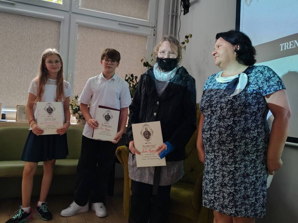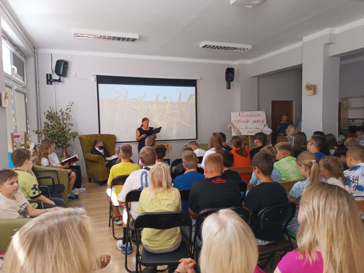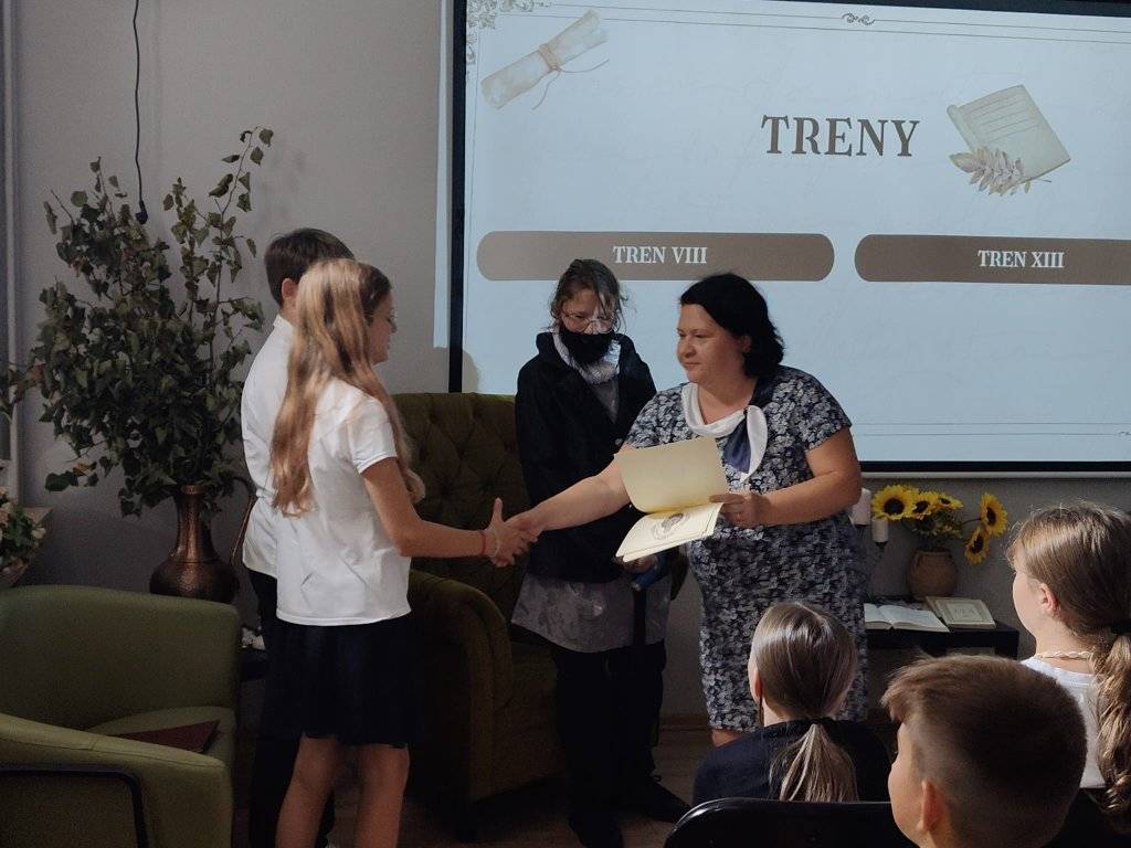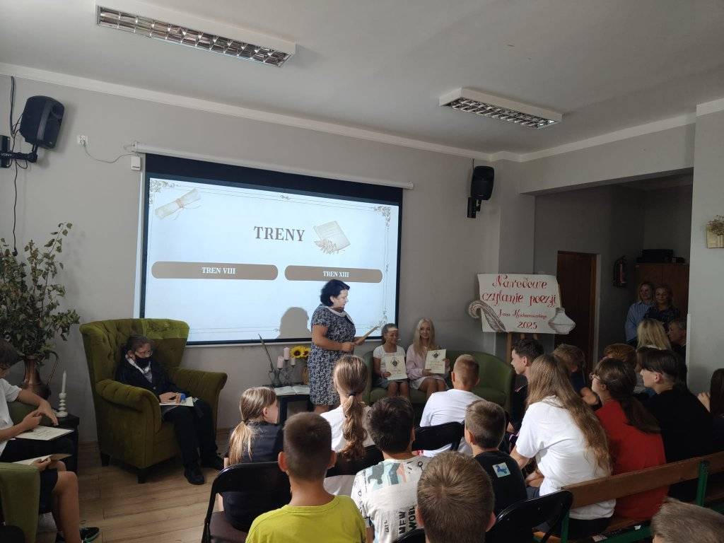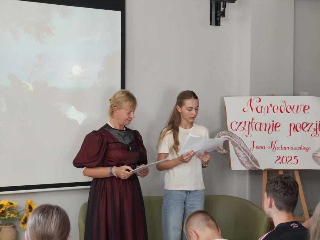 Piękna poezja Jana Kochanowskiego, opiewającą piękno świata i wartość życia, połączyła 5 września uczniów i nauczycieli z naszej szkoły, którzy z wielkim oddaniem zaangażowali się w przebieg kolejnej edycji Narodowego Czytania w Trójce. Do wspólnego świętowania zaprosiła nas Pani Dyrektor Lidia Jaroszewska. W zupełnie innej roli mogliśmy zobaczyć nauczycieli języka polskiego, matematyki, języka angielskiego, logopedę i pedagoga, którzy z wielkim kunsztem czytali fraszki, pieśni i treny Mistrza z Czarnolasu. Talentem oratorskim i scenicznym wykazali się również uczniowie, którzy wspaniale poradzili sobie z trudnym językiem epoki renesansu czytając m.in. fraszkę – "Na lipę", "Pieśń Świętojańską" i Tren VIII, a także wcielili się w rolę Jana Kochanowskiego i osób przeprowadzających z nim wywiad. Wyjątkowego klimatu dodała uroczystości piękna dekoracja przygotowana przez p. Alicję Stefaniak. Nad całym przebiegiem tego wyjątkowego wydarzenia czuwały: p. Justyna Kisiel i p. Iwona Sonka