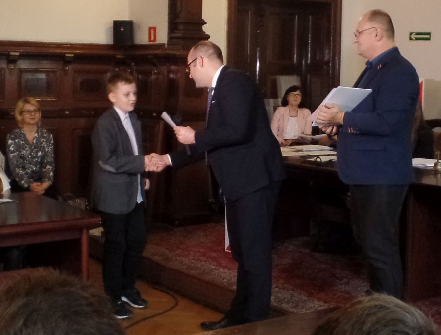 We wtorek w Sali Rajców w Ratuszu odbyła się pierwsza, uroczysta sesja Młodzieżowej Rady Miejskiej Kłodzka, w której wzięło udział dwoje naszych uczniów. Podczas spotkania do młodzieży przemawiali m. in.: Burmistrz Kłodzka Michał Piszko, Zastępca Burmistrza Kłodzka Wiesław Tracz, Przewodniczący Rady Miejskiej Tomasz Żabski oraz Radny Damian Ślak, prowodyr całego zajścia. Uczniowie klas szóstych Emilia Paszkowska oraz Paweł Gil, bo o nich mowa, zostali zaprzysiężeni na radnych, brali też udział w wyborach przewodniczącego rady, jego zastępcy oraz sekretarza.