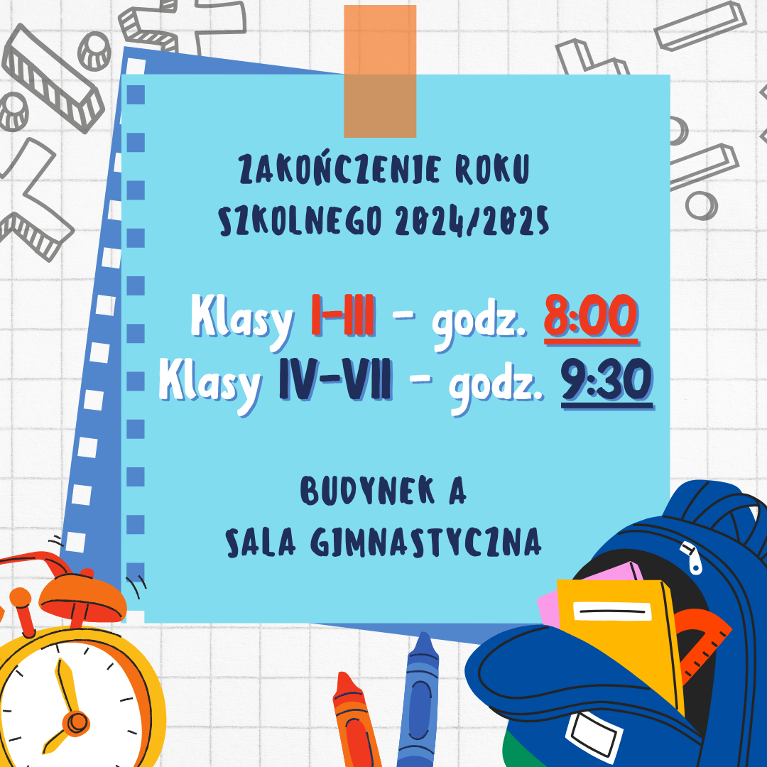 ZAKOŃCZENIE ROKU SZKOLNEGOAktualności » ZAKOŃCZENIE ROKU SZKOLNEGO26-06-2025Informujemy, że zakończenie roku szkolnego 2024/2025 odbędzie się 27 czerwca (piątek) na sali gimnastycznej w Budynku A. Klasy I-III przychodzą na godzinę 8:00, natomiast klasy IV-VII na godzinę 9:30.